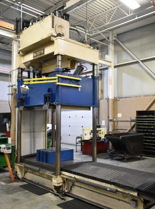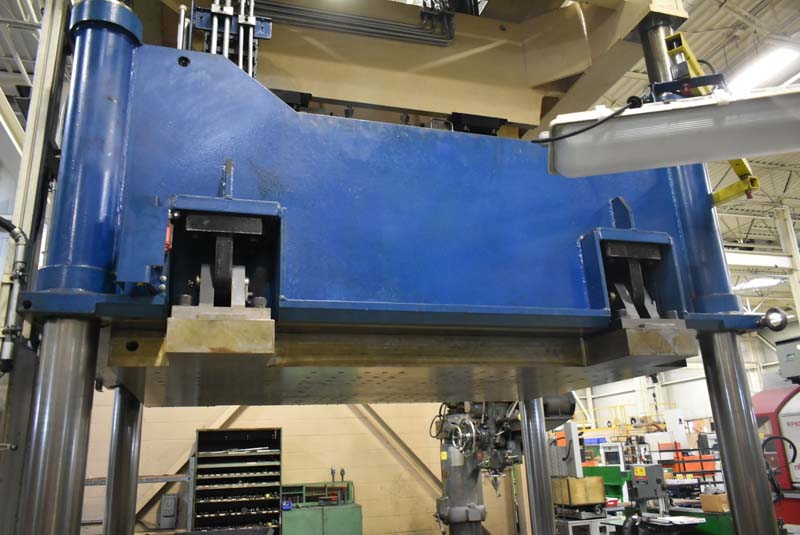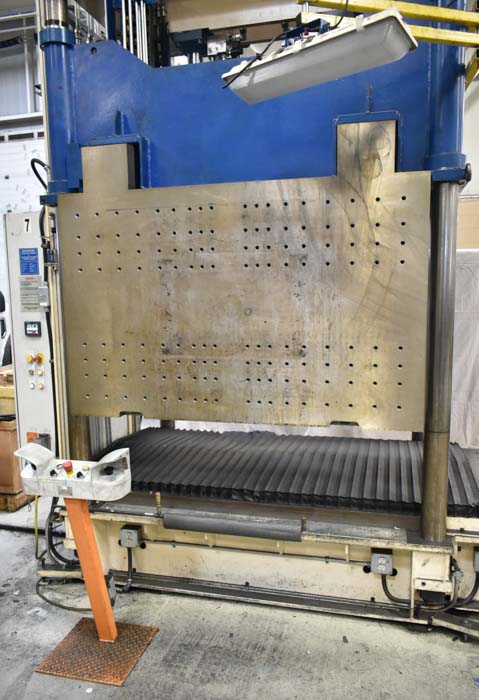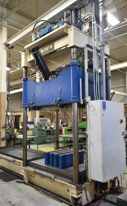 MACRODYNE (2010) MPS-50, 50-ton capacity 4 post hydraulic spotting press with PLC control, 53” stroke, 63” daylight opening, 65” x 42” tilting platen, left to right 65” x 42” shuttle table, 20HP s/n: 101071-MPS-50